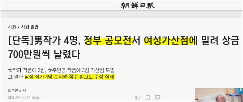 영화계 여성가산점 제도의 문제를 보도한 조선일보 기사