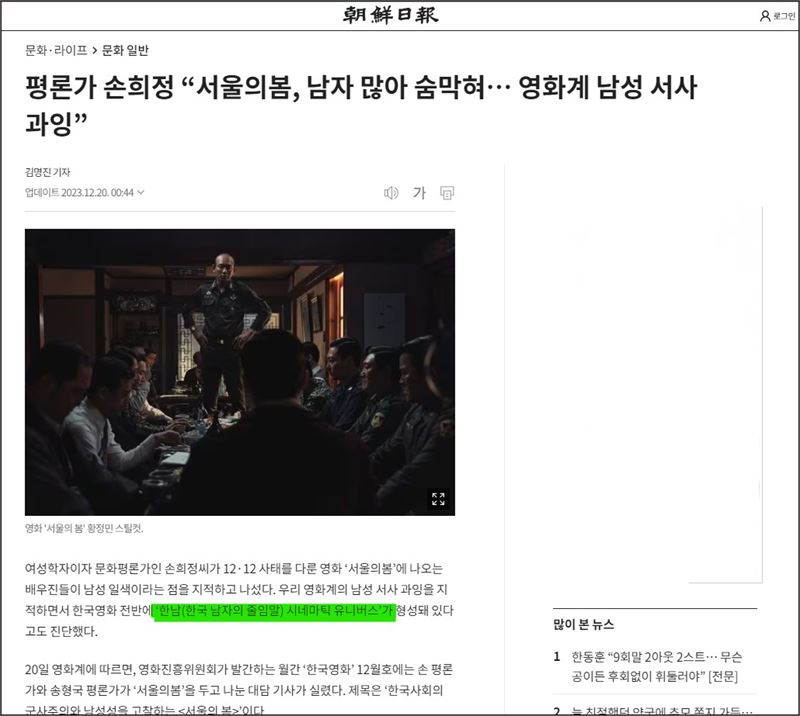 12월 20일자 조선일보에 "평론가 손희정 “서울의봄, 남자 많아 숨막혀… 영화계 남성 서사 과잉”이라는 기사가 실렸다. 한국영화에 남자배우들이 집단적으로 등장하고, 남자서사만 과잉되게 다뤄지는 것은 문제라고 지적하는 페미니스트 평론가의 주장을 보도한 기사다.
