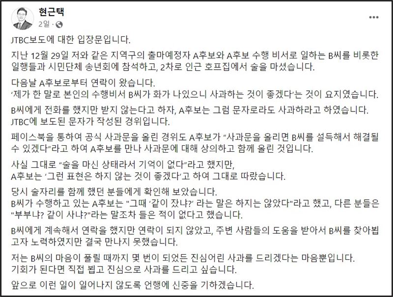보도에 따르면 현근택 후보는 나란히 앉은 피해호소인 여성과 경쟁후보인 남성 둘을 향해 문제의 발언을 했다고 한다. 그런데 여성은 현근택 후보의 발언으로 인한 충격으로 심각한 고통을 호소하고, 남성은 현근택 후보에게 여성이 고통스러워하니 사과할 것을 요구한다. 그러면서 자신의 수행비서를 제대로 지켜주지 못한 미안함까지 표한다. 경쟁후보인 남성은 자신 또한 피해자라는 말을 했지만 이는 사건이 크게 확산된 후의 발언이었고 초반에는 일관되게 여성의 보호가 우선이었다.