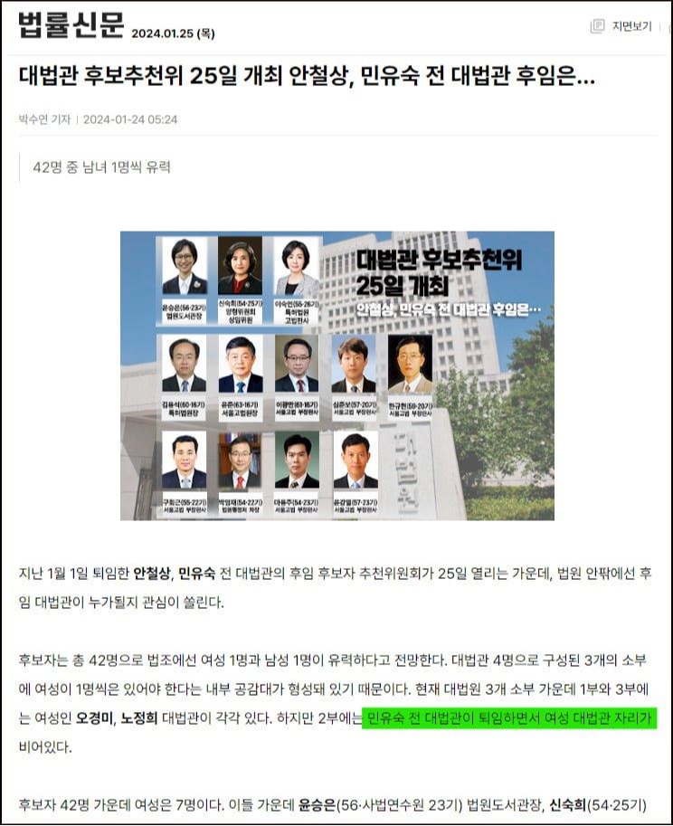민유숙, 안철상 대법관 퇴임 후 대법원은 신임 대법관 후보군을 발표했다. 법률신문은 이를 보도하면서 기사에 다음과 같은 문장을 썼다.