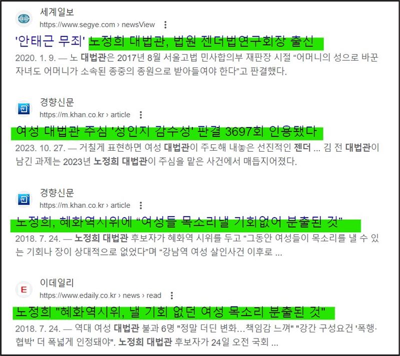 젠더법연구회 회장 출신 노정희 대법관을 보자. 지난 대선 때 선관위원회는 부실한 선거관리로 큰 비난을 받았고 노정희 당시 선관위원장은 사과마저 제대로 하지 않아 더 큰 빈축을 샀다. 결국 불명예스럽게 사퇴했다.