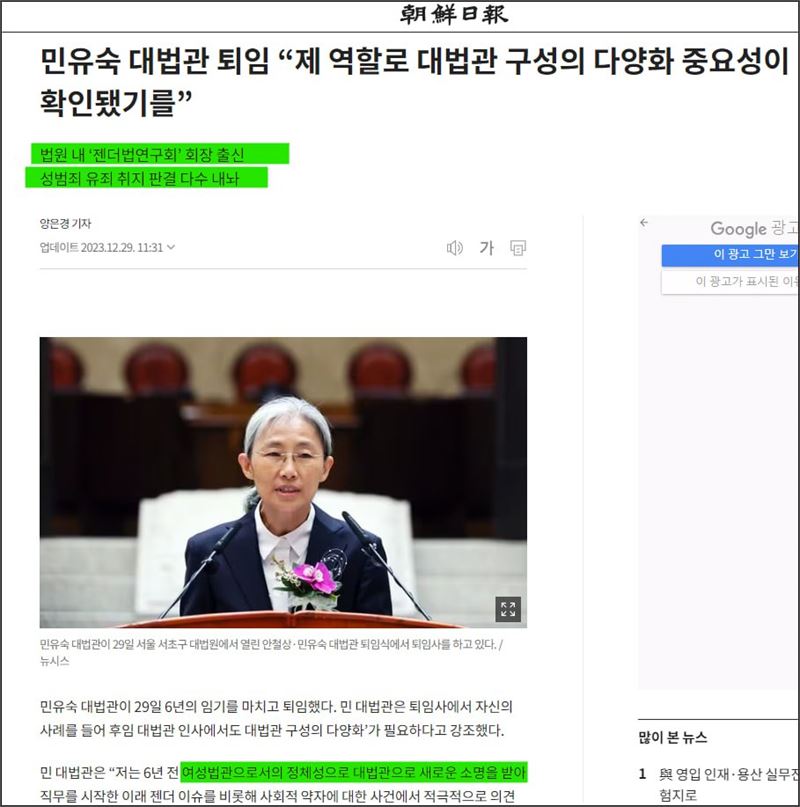 대표적인 사례가 민유숙 전 대법관이다. 얼마전 6년 임기를 마치고 퇴임한 민유숙 대법관은 젠더법연구회 회장 출신으로 대법원의 셀프 여성할당으로 대법관이 된 사람이다. 스스로도 "여성 법관으로서의 정체성"으로 대법관 소명에 임했다고 밝혔다. 법관은 오직 법관으로서의 정체성에 충실하여야 하는데, 여성이라는 정체성을 우선한다는 것부터 스스로의 편향성을 드러내는 부적절한 발상이다.