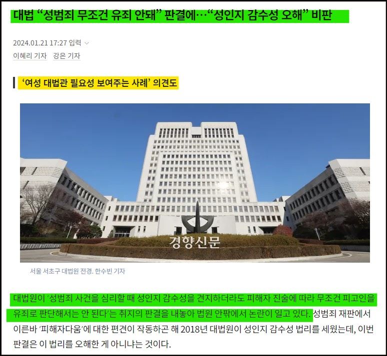 그러던 중 최근 성인지 감수성 판결에 제동을 건 대법원 판결이 있었다. 2024년 1월 21일, 대법원은 ‘성범죄 사건을 심리할 때 성인지 감수성을 견지하더라도 피해자 진술에 따라 무조건 피고인을 유죄로 판단해서는 안 된다’는 취지의 판결을 내놨다.(물론 대법원의 이번 판결이 앞으로 성인지 감수성 재판의 변화를 가져올 것이라는 기대는 섣부르다.)