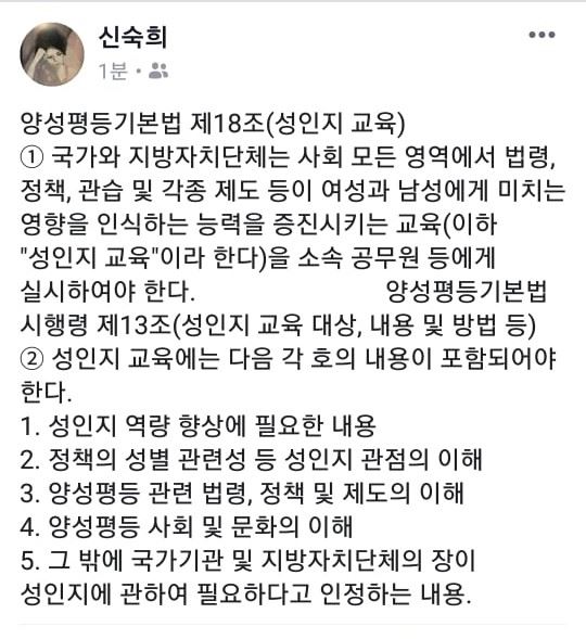 이번 대법관 후보로 거론되는 여성 법관 중 신숙희 판사 또한 젠더법 연구회 출신이며, 성인지 감수성을 적극적으로 옹호해온 인사다. 그녀는 성인지 감수성을 옹호하기 위해 양성평등기본법을 언급한다. 또한 대법원 양형위원회 상임위원으로 재직하며 성적 수치심을 성적 불쾌감으로 바꾸는 일을 주도했다.