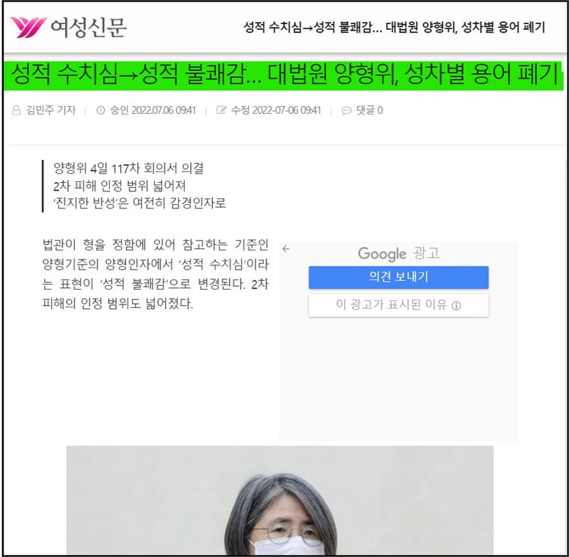 신숙희 대법관 후보자는 대법원 양형위원회 상임위원으로 재직하며 성적 수치심 용어 폐기를 주도했다.(출처: 여성신문)