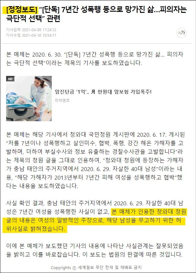 남성을 무고하기 위해 허위폭로를 한 여성. 이를 즉각 사실로 보도한 미디어의 행태 또한 페미니즘의 폐해다.(출처: 세계일보)