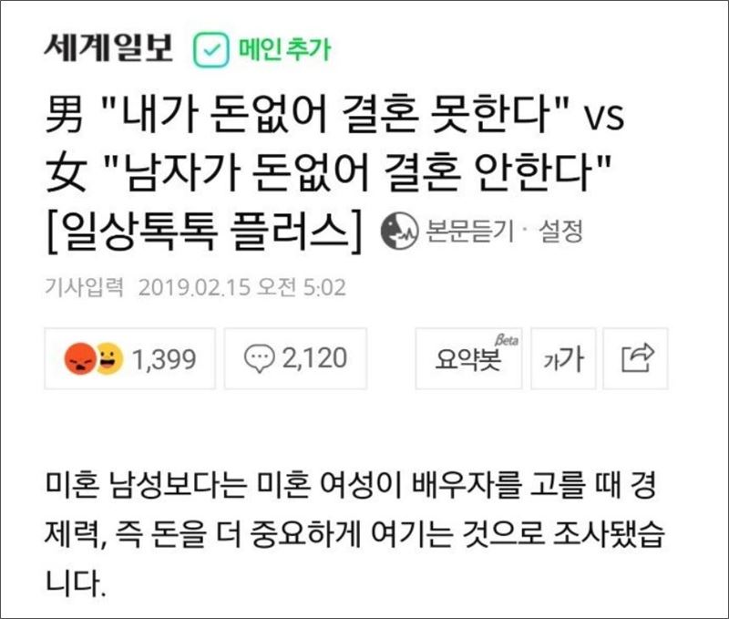 남성들은 자신이 돈이 없으니 결혼을 '못한다'고 하고, 여성들은 남성이 돈이 없으니 결혼을 '안한다'고 한다. 아무리 여성이 주체적이 되고 경제활동을 하는 세상이 되었다고 해도 미혼 여성이 배우자를 고를 때 가장 중요하게 여기는 것은 여전히 상대 남성의 경제력이다.