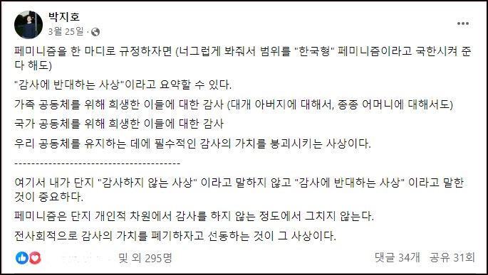 경제학자 박지호 교수는 페미니즘을 '감사에 반대하는 사상'이라고 명명한 바가 있는데 상당히 적절한 분석이라고 생각한다.