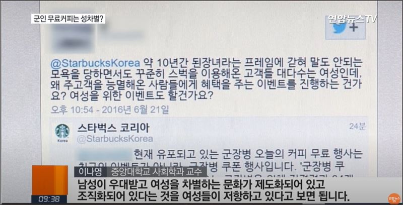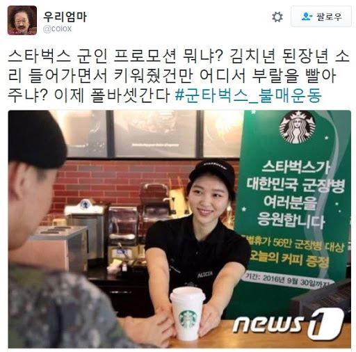 스타벅스 군인대상 이벤트에 반대하는 트위터 페미니스트