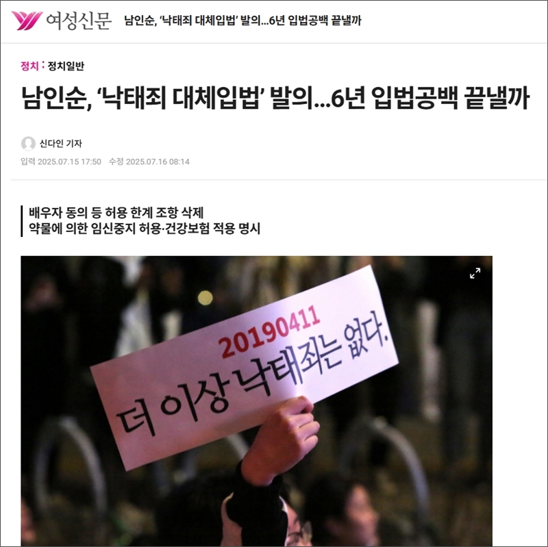 2019년 이후 입법공백 상태였던 낙태관련 대체법안이 발의됐다. 민주당 남인순 의원과 이수진ㆍ서미화ㆍ전진숙ㆍ조계원ㆍ박주민ㆍ최혁진ㆍ김 윤ㆍ이재정ㆍ전종덕ㆍ손 솔 등 11명은 2025년 7월 11일 [모자보건법 일부개정법률안]을 발의했다.