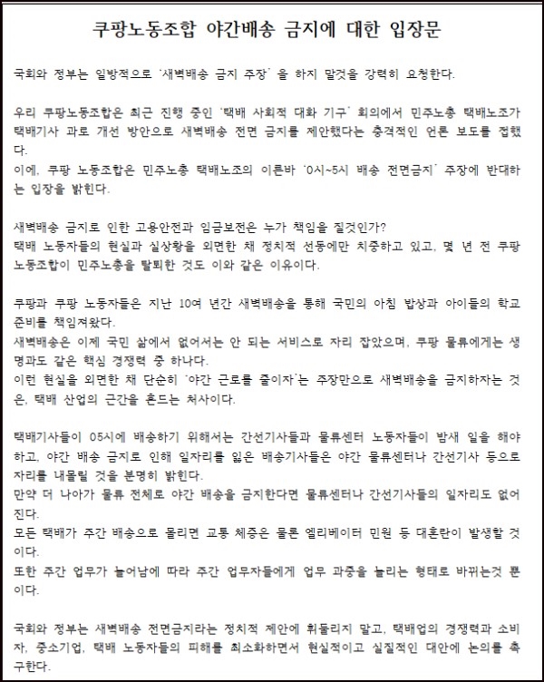 쿠팡노동조합은 즉각 야간배송 금지에 반대하는 성명을 발표했다.