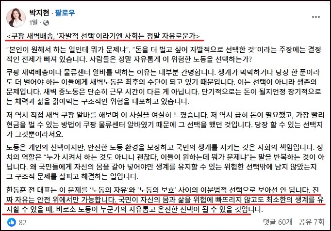새벽 배송을 금지하자는 이들은 장기적으로 건강을 망치는 게 당장의 돈보다 훨씬 밑지는 장사이기 때문에 결국 손해보는 건 가난한 사람들이라고 한다. 가난한 사람을 위한 선량하고 정의로운 행동임을 의심하지 않는다.