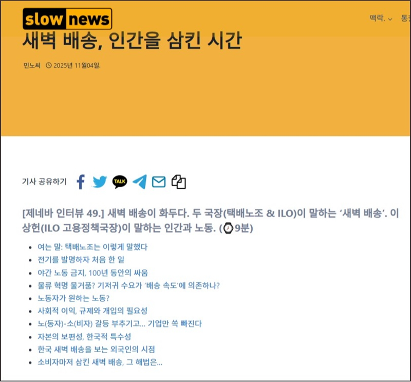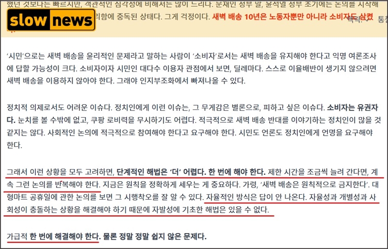 슬로우뉴스에서 보도한 새벽 배송 금지 주장. 후견주의의 논리를 확인할 수 있다.(출처: 슬로우뉴스 화면캡처)