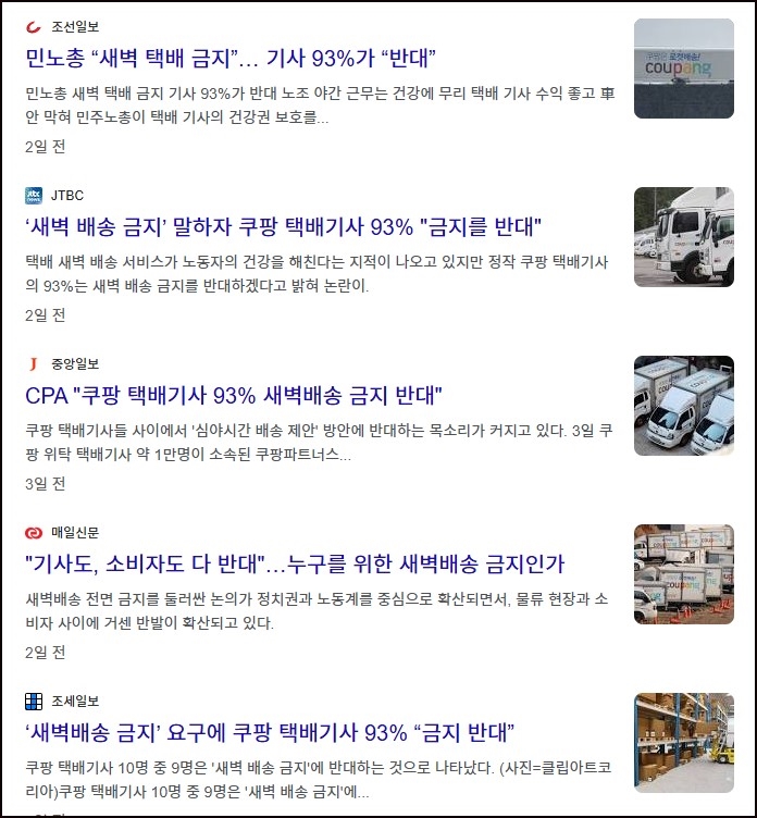 쿠팡 택배기사의 93퍼센트가 새벽 배송 금지를 반대한다.