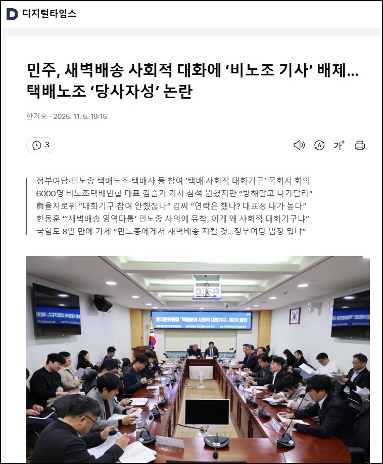 새벽 배송 논쟁이 확산된 후 택배사회적 대화기구 회의장에 비노조 택배기사조직의 대표 김슬기씨가 참여를 희망하며 찾아갔으나 거부당했다.